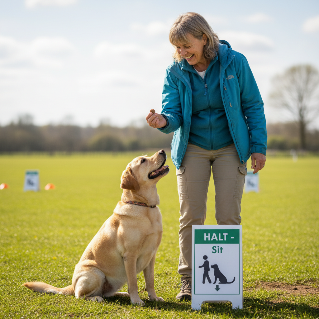 This is one of the most common signs you’ll encounter. It’s a simple test of basic obedience. As you approach the sign, you will stop moving (HALT), and your dog should automatically sit in heel position without a specific command. If they don’t, you can give a cue. The key is a smooth stop and a prompt sit. Practice this by walking a few steps in your living room, stopping, and rewarding your dog for sitting nicely at your side.