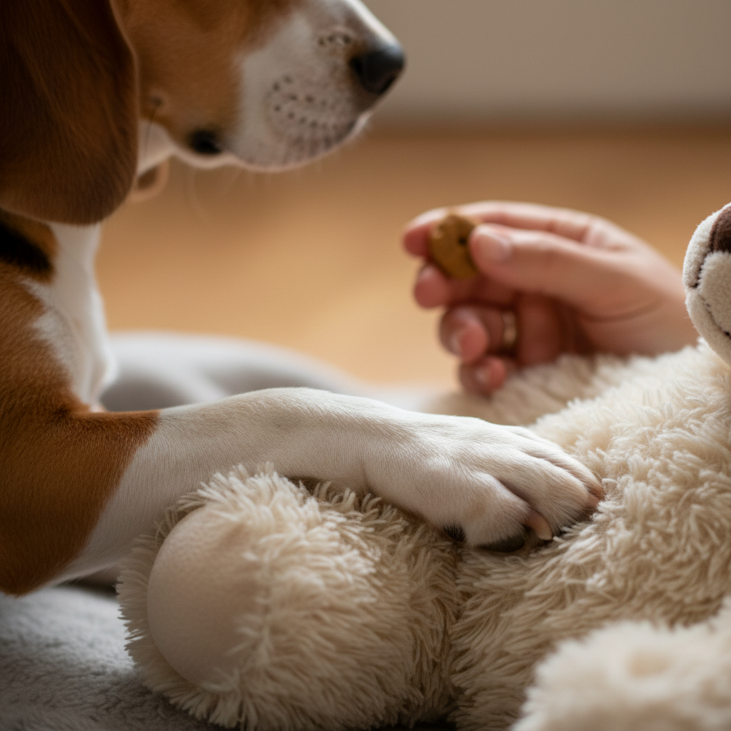 Remember, this stage is all about making the teddy bear a wonderful thing to interact with calmly. If your dog starts to get mouthy or wants to chew the bear, simply trade the bear for a treat and put it away for a moment to reset. We want to reward gentle paw interactions only.