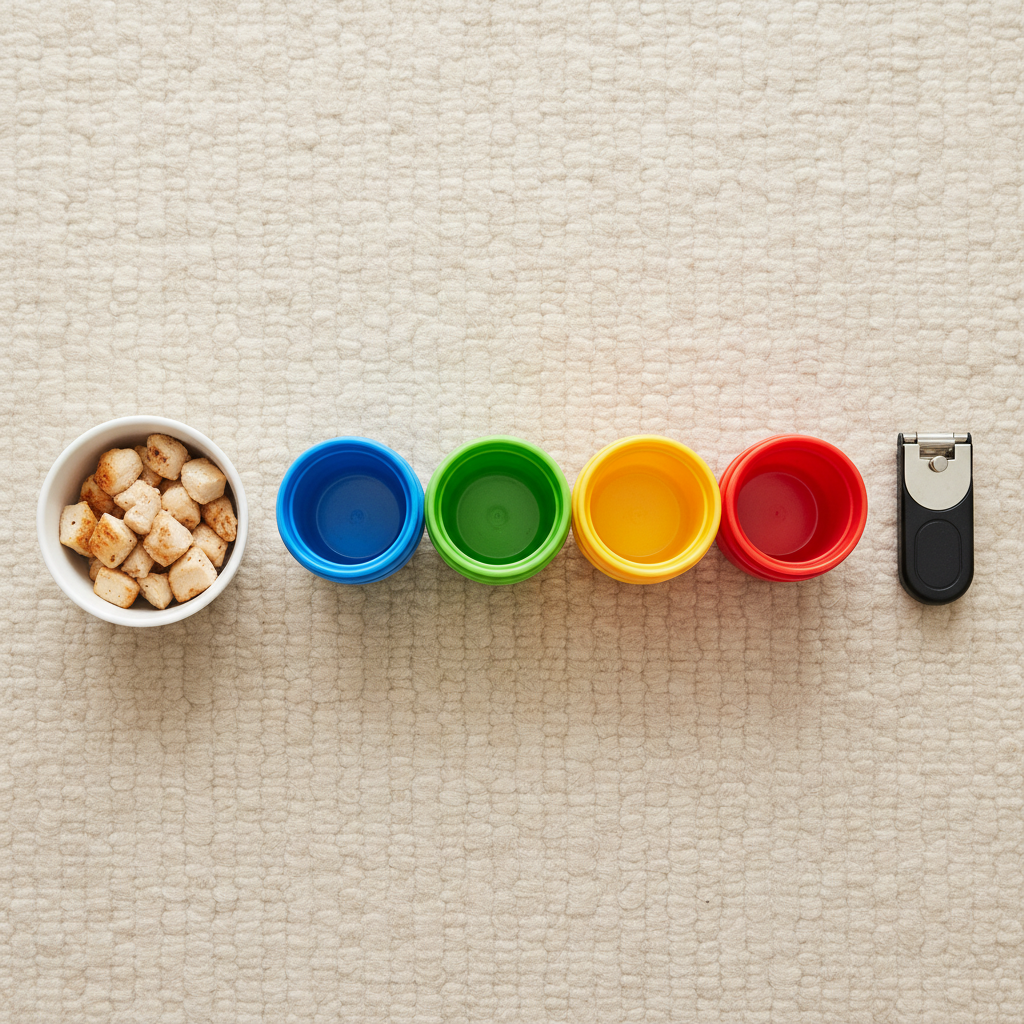 Once you have your gear, get your treats ready in a pouch or a small bowl within easy reach, and let your dog see the cups to build some initial curiosity. Let the games begin!