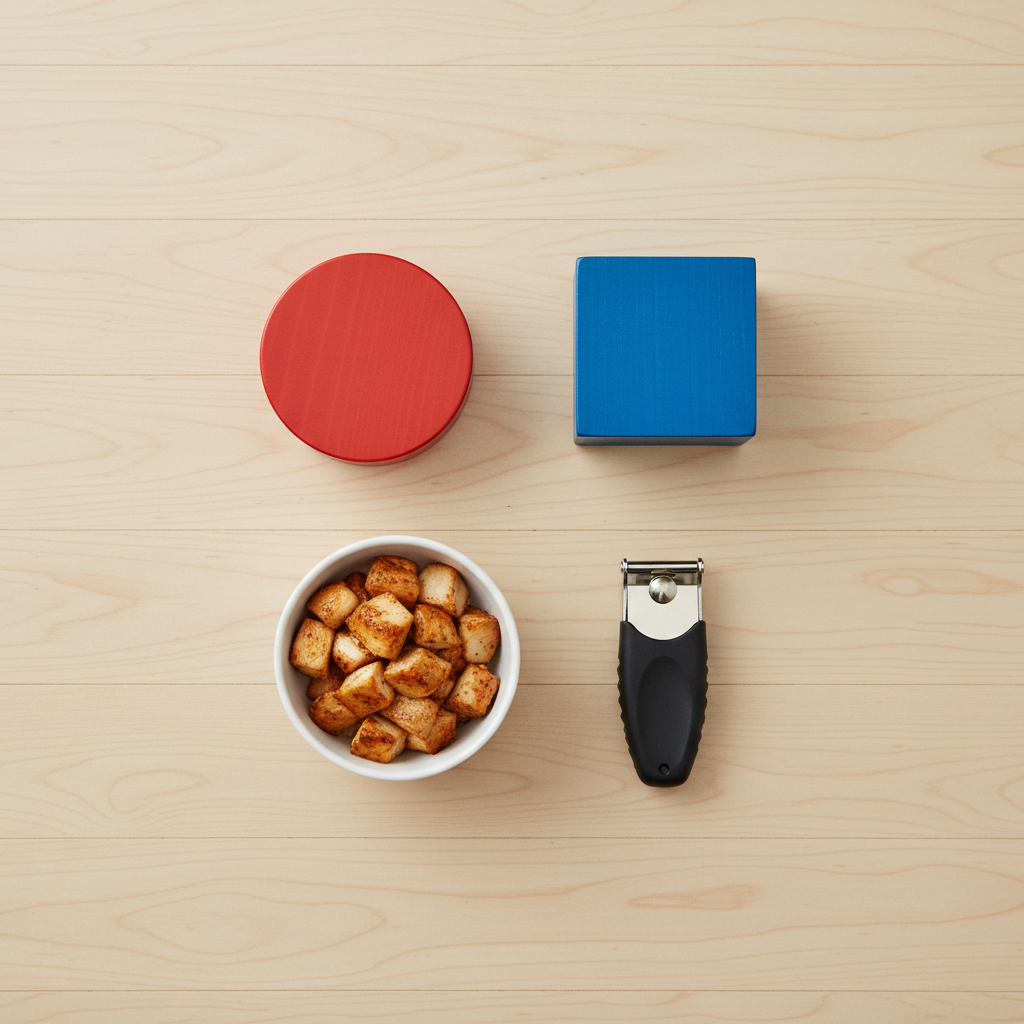- Two Distinct Shapes: You’ll need one square and one circle. It’s best if they are similar in size and material but different in color to start. For example, a red circle and a blue square. You can use cutouts from sturdy cardboard, wooden blocks, or even purchase plastic or foam shapes from a craft store. The key is that they feel similar to your dog’s nose or paw but look different.