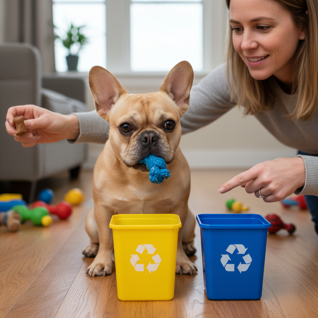 Once your dog is reliably putting the blue toys in the blue bin, end the session. Later, or on another day, repeat the entire process from Step 1, but this time with only the yellow toys and the yellow bin. Use the same verbal cue (“Bin!”). This prevents confusion by teaching each color concept independently.