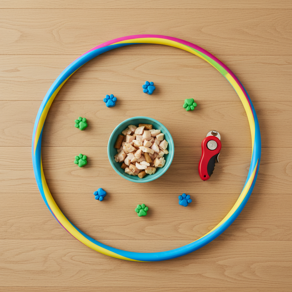 - Treats Around and Inside: Scatter a few high-value treats around the outside of the hoop. Once they are comfortable eating those, place a few treats just inside the rim of the hoop. The goal is to have them happily stick their head inside the circle to get a reward.
