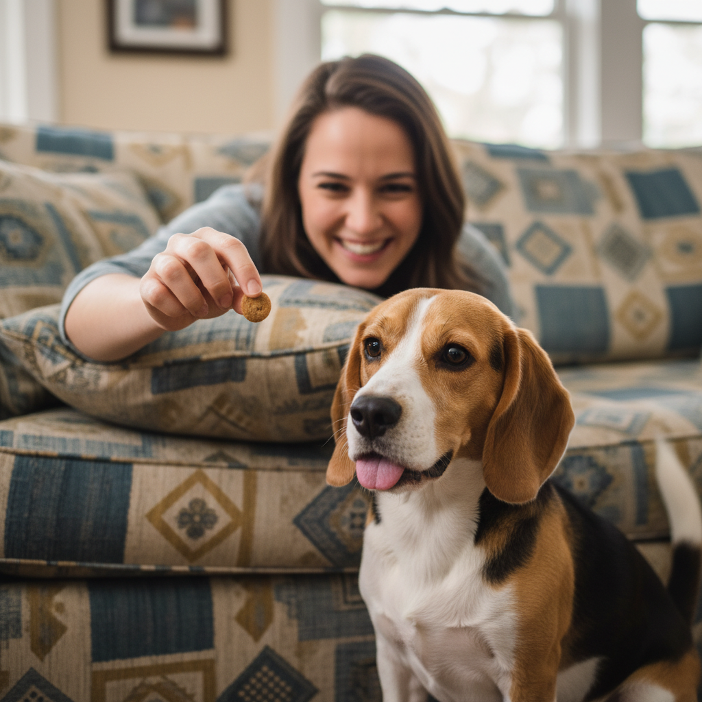 Before we even get to the sofa, let’s teach the basic concept. Sit on the floor in front of your dog. Hold a treat in your hand where they can see it. Now, simply duck your head behind the sofa arm or a cushion for just one second. Immediately pop back up with a cheerful, high-pitched “Peekaboo!” and give them the treat. Repeat this 5-6 times. We’re teaching them that when you briefly disappear and reappear, something wonderful happens.