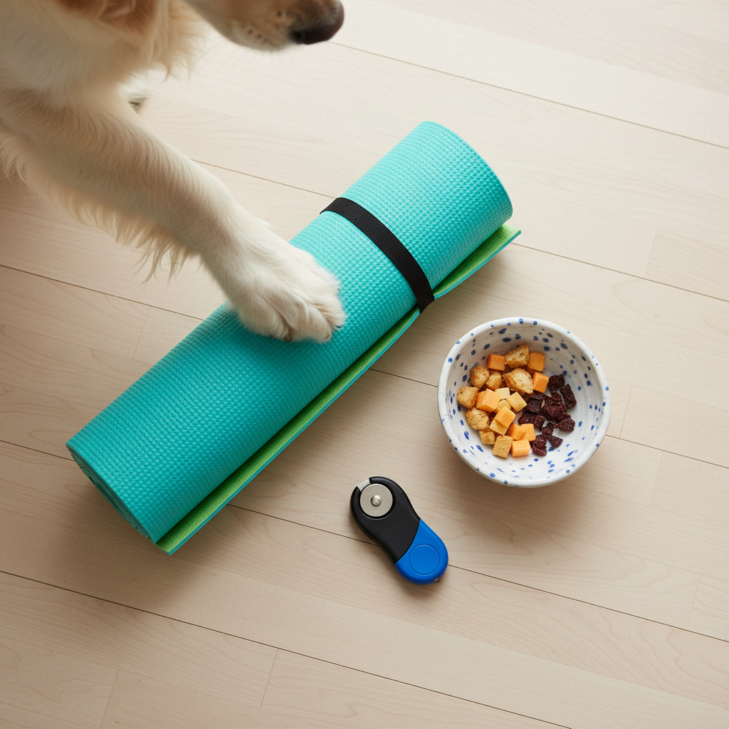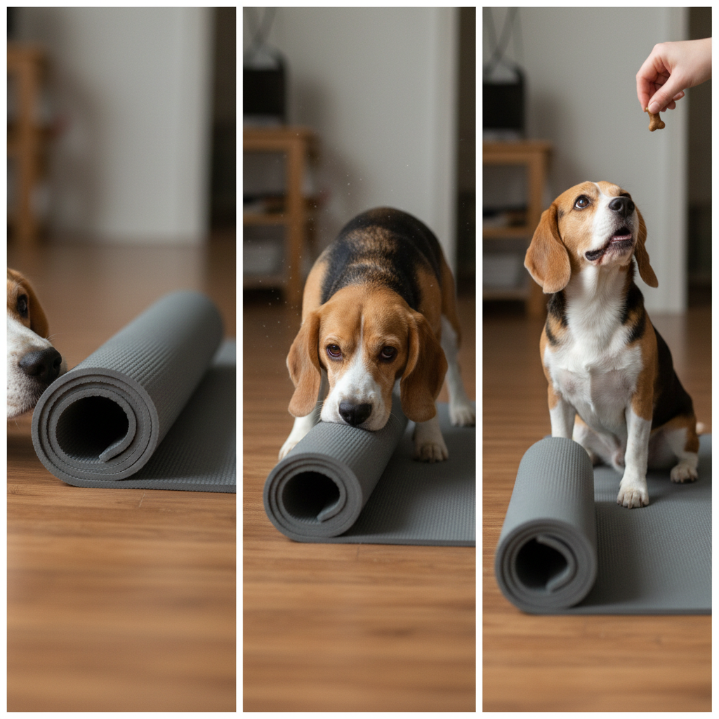 The first step is simply getting your dog comfortable with this new object. Place the rolled-up yoga mat on the floor. The moment your dog shows any interest—sniffing it, looking at it, booping it with their nose—click (or say “Yes!”) and give them a treat. Toss the treat a short distance away so they have to ‘reset’ and approach the mat again. Repeat this 5-10 times. We’re building a positive association: good things happen when I’m near this rolled-up thing!