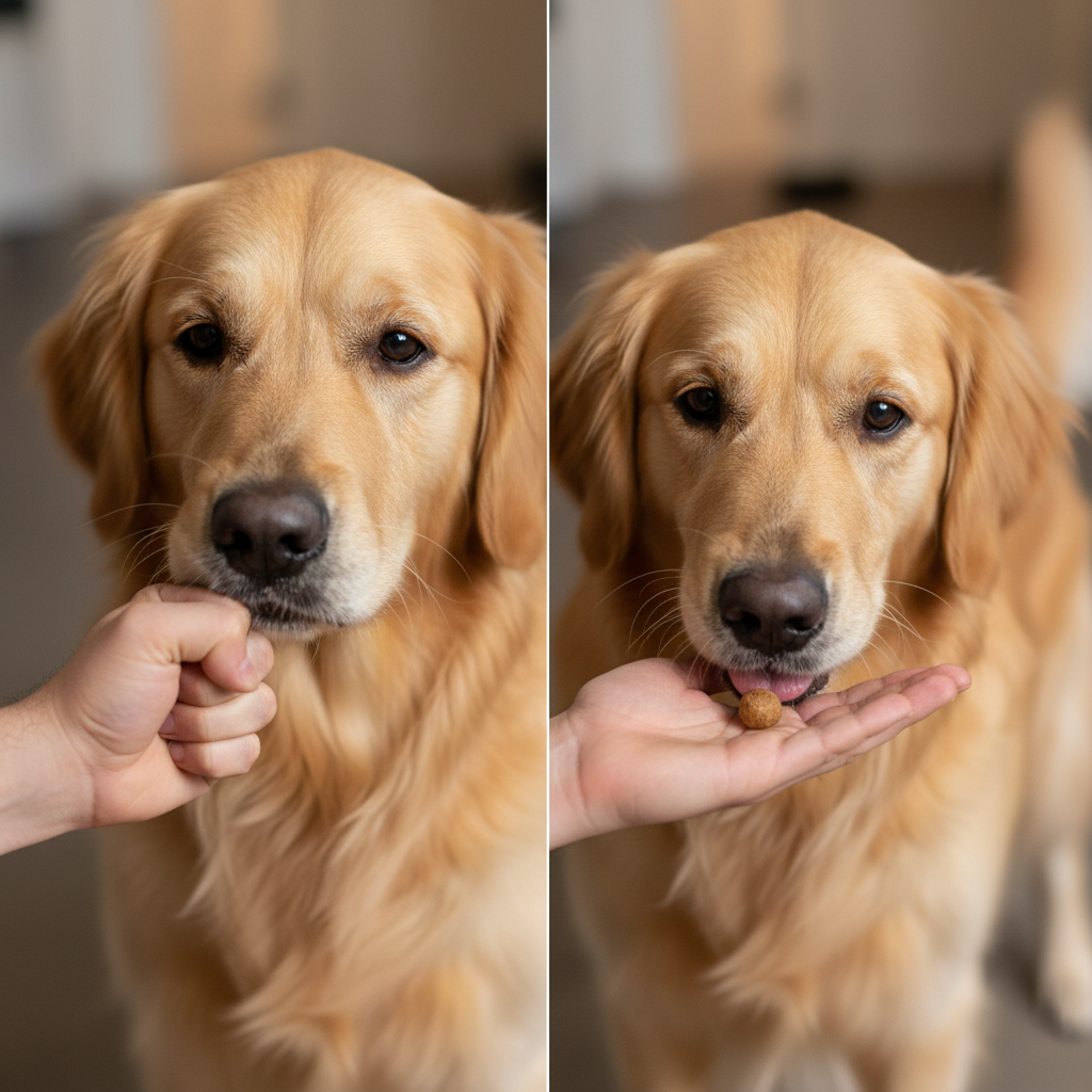 - Approach and Cover: As your dog moves toward the treat, be ready. If they lunge with an open ‘shark mouth,’ quickly close your fingers over the treat to protect it (like in the first method).