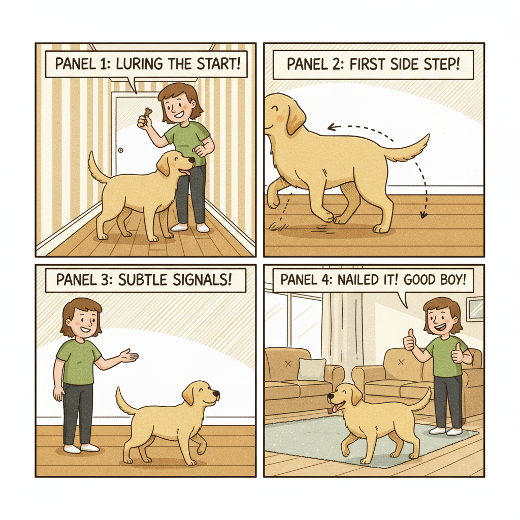 Now that your dog understands the physical gesture, we can attach a word to it. Choose a short, clear cue like ‘Side,’ ‘Step,’ ‘Shuffle,’ or ‘Move.’