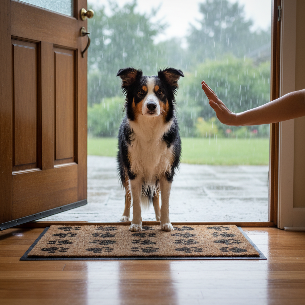 This is the ultimate test of impulse control and the holy grail for mess-free entrances. After coming inside from the rain, ask your dog to ‘sit’ and ‘wait’ at the door. Only after you’ve grabbed a towel and are ready, give them the ‘shake off’ command. This combines two commands and teaches your dog to wait for permission, preventing them from shaking the second they cross the threshold.