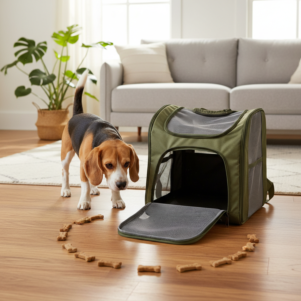 Use a specific verbal cue, like “Get in your bag!” or “Hometime!” in a happy, upbeat tone. Lure your dog into the bag with a treat. As soon as all four paws are inside, say “Yes!” and give them a jackpot of treats inside the bag. Let them come right back out. Repeat this until they’re hopping in eagerly when you give the cue. Once they’re comfortable, start building duration. Ask them to stay in for 2 seconds, then reward. Then 5 seconds, then 10, gradually increasing the time.