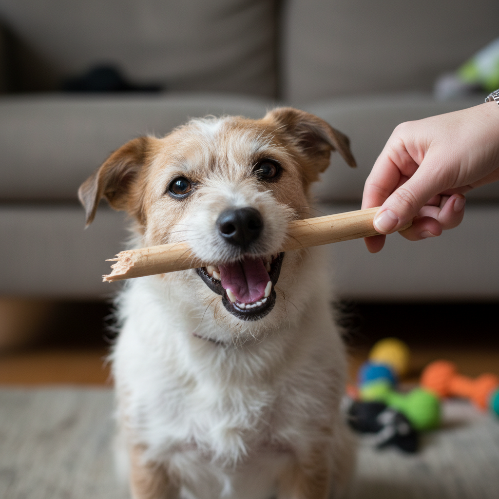 Now, we want to encourage your dog to put their mouth on the object. Hold the dowel out. This time, wait for them to open their mouth and touch it. The instant their teeth or lips make contact, click and treat. At this stage, they’ll likely just nibble or bite it for a split second, and that’s perfectly fine! We’re shaping the behavior. Once they are consistently offering to put their mouth on it, you can add a verbal cue like ‘Take It’ just as they are about to make contact.