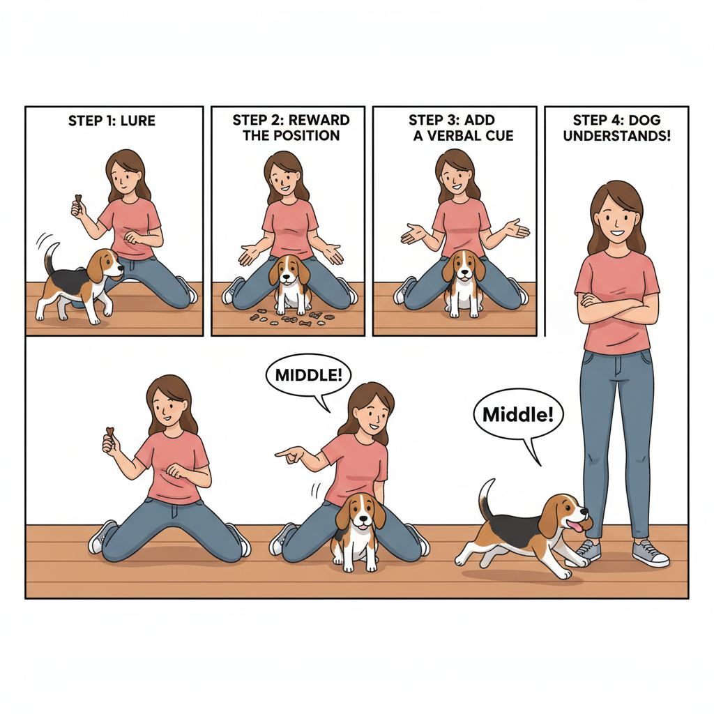 - Eventually, you should be able to stand with your feet apart, say “Middle!” and have your dog move into position without any hand signal at all. This takes time and repetition, so be patient!